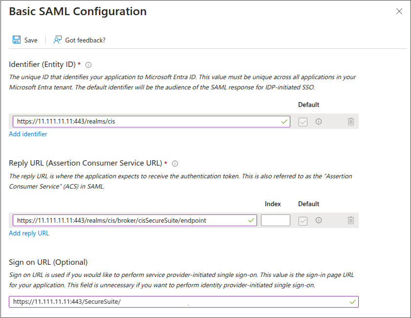 - Reply URL (Assertion Consumer Service URL): Enter or paste the Redirect URI from the IdP page in the CIS SecureSuite Platform's Admin area.
